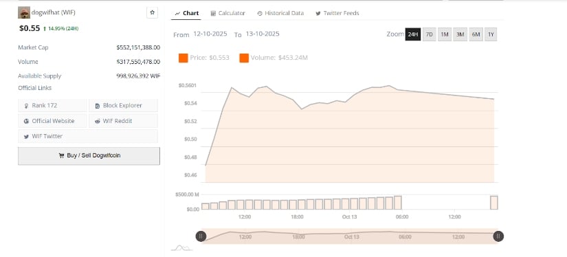 Innerhalb nur eines einzigen Tages erlebte Dogwifhat einen äußerst heftigen Aufschwung und kletterte um fast 15 % auf einen Stand von 0,55 $. Diese Wiederauferstehung erfolgte nicht ohne Begleitung, denn die Marktkapitalisierung stieg auf 552 Millionen US-Dollar, gestützt durch ein tägliches Handelsvolumen von 317 Millionen US-Dollar. Man könnte beobachten, dass ein solcher Anstieg das Ergebnis einer erneuten Kauflust ist, wobei die Aktivität der Wale im Bereich von 0,50 bis 0,54 US-Dollar liegt, ein sicheres Zeichen für ihre zunehmenden Launen. 🛍️💼