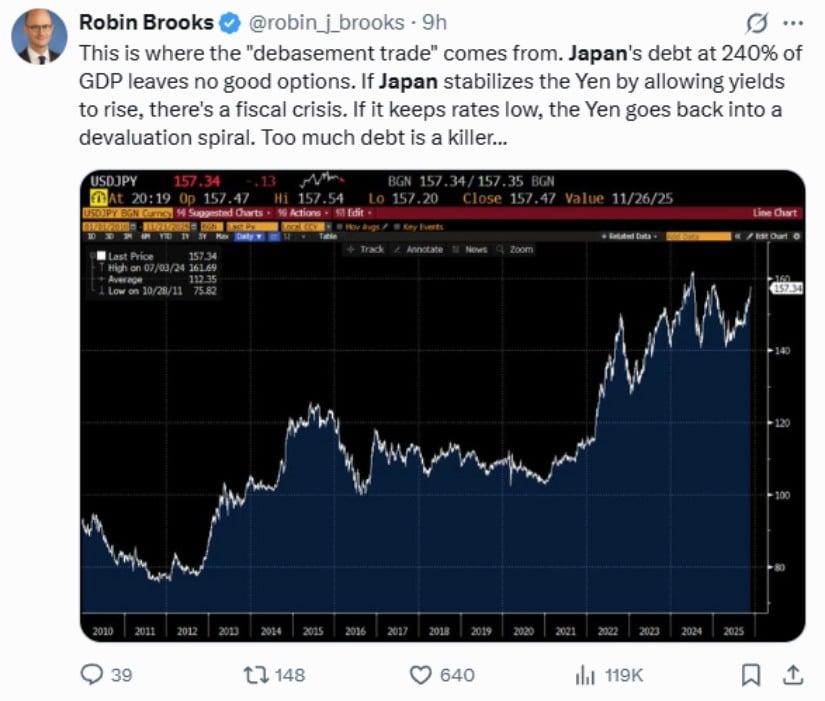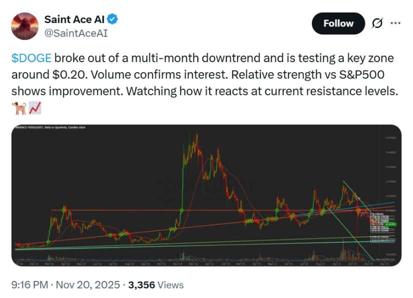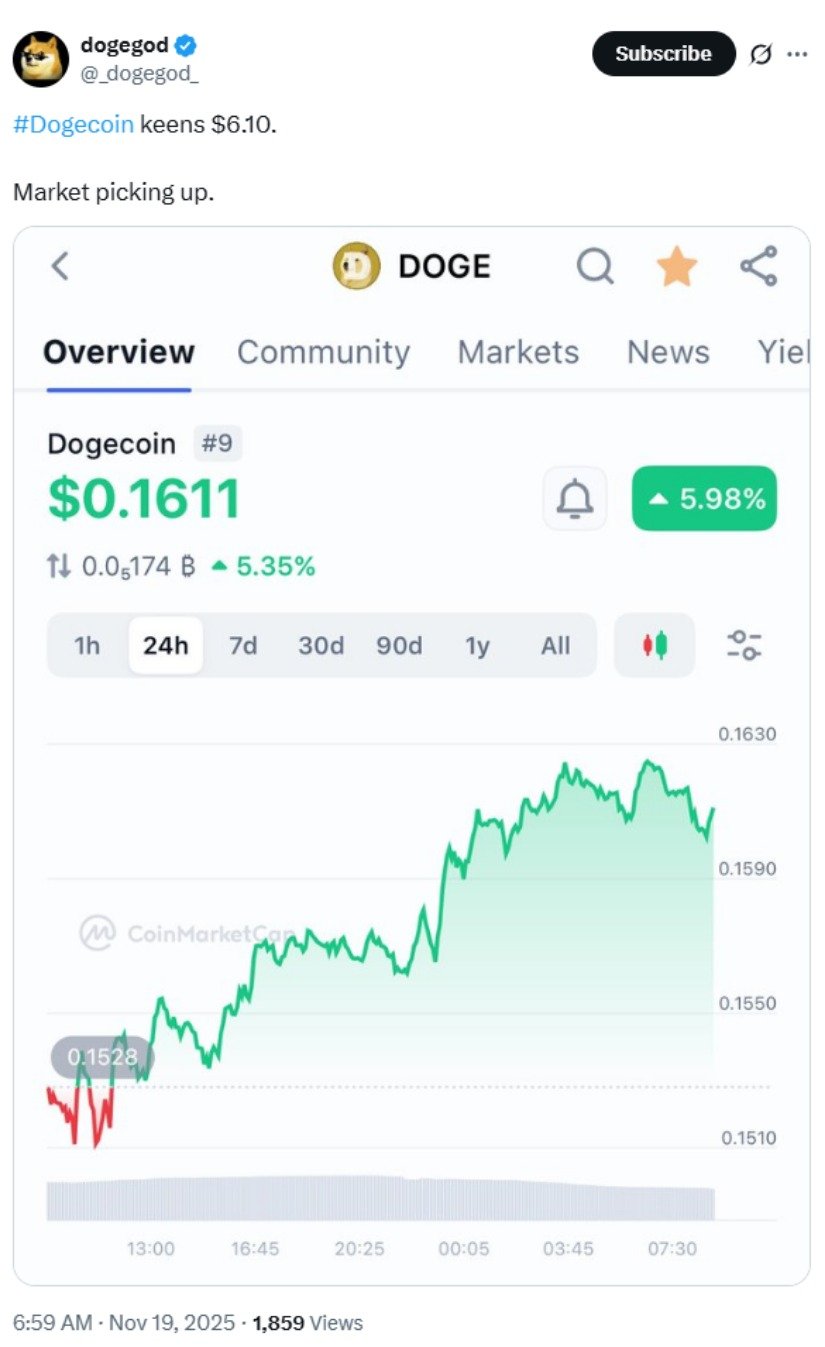 Am 20. November 2025 liegt der DOGE-Preis stabil bei 0,154 US-Dollar, obwohl er gegenüber seinen früheren Höchstständen von 0,160 US-Dollar einen leichten Rückgang erlitten hat. Auf dem Tages-Chart durchbricht es eine langfristige Trendlinie wie ein Bulle im Porzellanladen, wobei das Volumen schneller steigt als die Versprechen eines Politikers. Nun, Lautstärke ist eine gute Sache, aber kein goldenes Ticket nach Bullishville. 🚀📈