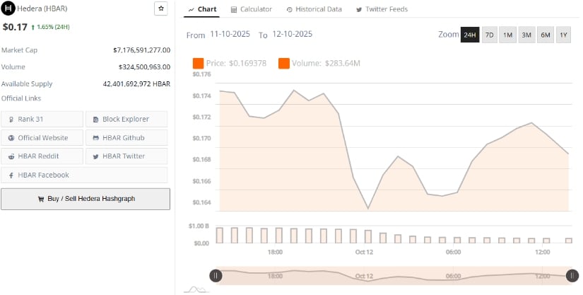 Neue Daten von BraveNewCoin (denn wer liebt nicht eine gehörige Portion Mut in seinen Nachrichten?) zeigen, dass Hedera bei 0,17 $ schwebt, ein bescheidener Anstieg von 1,65 % in den letzten 24 Stunden. 🎉 Die Marktkapitalisierung des Netzwerks beträgt stolze 7,17 Milliarden US-Dollar und sein 24-Stunden-Handelsvolumen beträgt 324,5 Millionen US-Dollar. Das ist richtig, menschenaktiv und doch vorsichtig, wie eine Katze, die eine verdächtige Gurke beäugt. 🐱🥒