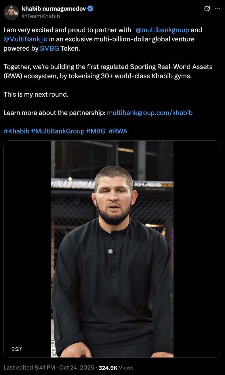 Die MultiBank Group, ein Gigant der Welt der Finanzderivate, hat sich mit Khabib Nurmagomedov zusammengetan, einem Mann, der in der UFC mit 29:0 ungeschlagen ausschied und nun versucht, die Blockchain-Arena mit der gleichen Wildheit zu erobern, die er einst im Achteck an den Tag legte. 🥊
