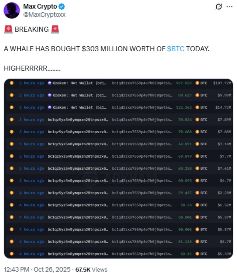 Max Crypto bemerkte: „HIGHERRRRR… ein Wal hat heute $BTC im Wert von 303 Millionen US-Dollar gekauft“, was das anhaltende institutionelle Interesse an Bitcoin hervorhebt. Institutionelles Interesse? Eher wie „institutionelle Verzweiflung“. 💸😵