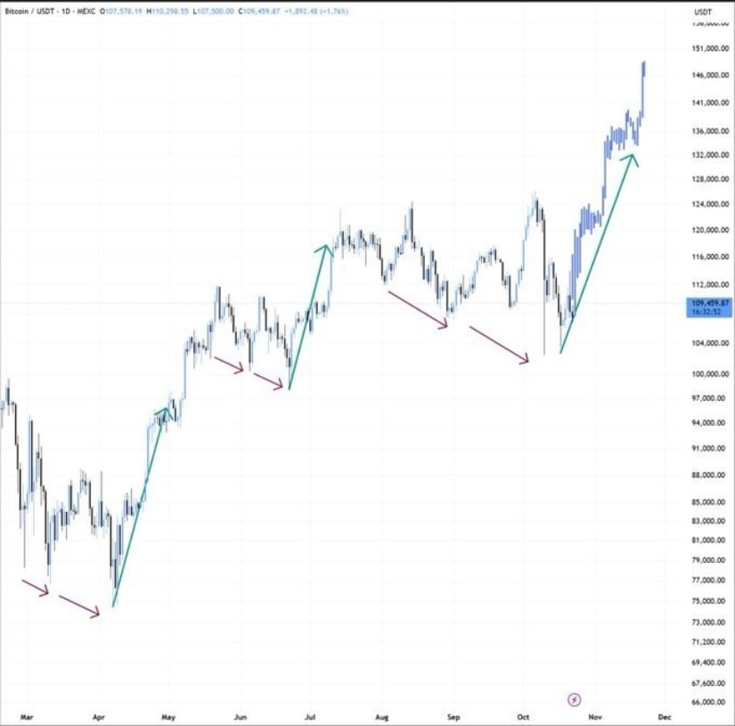 Bestimmte technische Experten, die sich mit dem Studium von Diagrammen und Linien befassen, nehmen die Bildung eines „dreifach niedrigeren Tiefs“ wahr. Es klingt ziemlich bedrohlich, nicht wahr? Es scheint, dass BTC in dieser Herbstsaison dreimal gestolpert ist. Ein gewisser Herr BitBull, ein bekannter Krypto-Kommentator (oder vielleicht auch nur anhaltender Enthusiasmus), sagt mit der Miene eines Wahrsagers einen schnellen Aufstieg zu einem „neuen ATH“ voraus – ein Allzeithoch für den Uneingeweihten. 🙏
