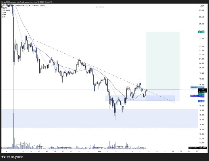 Kevins akribisches Diagramm zeigt, dass AVAX in einer Spirale gefangen ist und von einer absteigenden Trendlinie verschlungen wird, die seit Wochen düster präsent ist. Der kleine Motor, der innerhalb dieser Kompression noch höhere Tiefststände erreichen könnte, ist ein hoffnungsvolles Zeichen dafür, dass die Käufer das Angebot in der Nähe von 16,2 bis 17,3 US-Dollar nach und nach, so geduldig, aufsaugen. Die Indikatoren und EMAs erwachen und beginnen sich nach oben zu bewegen, was darauf hindeutet, dass ein Ausbruch unmittelbar bevorsteht. 🤞🔮