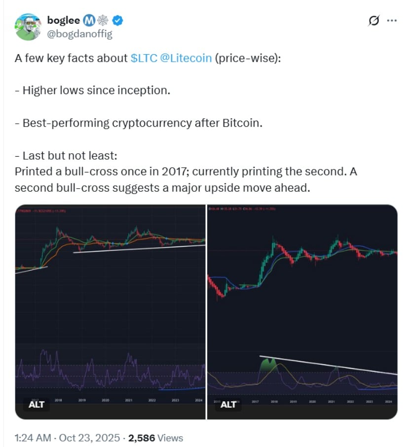 Analysten deuten nun auf eine Mischung aus langfristiger Unterstützung, bullischen Crossovers und historischen Präzedenzfällen hin, die die explosiven Rallyes von Litecoin in früheren Zyklen widerspiegeln. Denn wer liebt nicht die gute „Diesmal ist es anders“-Stimmung? 🤷♂️