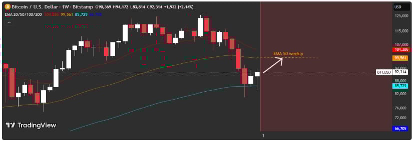 TradingView-Analyst FlorinCharts sagt: „Wenn Bitcoin den 50-Wochen-EMA durchbricht, könnte es auf 120.000 US-Dollar hochschnellen. Aber wenn es scheitert, stehen wir vor einer Achterbahnfahrt.“ 🎢