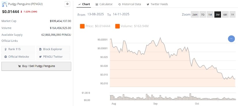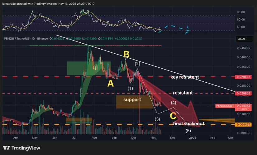 Der 3-Monats-Chart von Brave New Coin, eine Chronik des langsamen Verfalls, zeigt einen Preis, der stetig ins Leere blutet. Das Volumen, der Lebensnerv der Märkte, schwindet wie ein sterbender Stern, sodass Rallyes und Ausverkäufe gleichermaßen zu hohlen Gesten werden. PENGU klammert sich an 0,014 US-Dollar, ein Geist seines früheren Selbst, während die Unterstützungsniveaus bei 0,018 US-Dollar und 0,020 US-Dollar wie Sandburgen in einem Sturm zusammenbrechen. Was ist Volumen, wenn nicht der Herzschlag des Marktes? Und welche Hoffnung bleibt für den Pinguin ohne sie? 🐟🌊