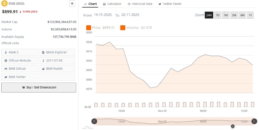 Laut BraveNewCoin wird BNB jetzt bei 899,91 $ gehandelt, ein Rückgang um 3,16 %, der selbst den stoischsten Händler dazu bringt, zu den Antazida zu greifen. Marktkapitalisierung: 123,90 Milliarden US-Dollar. Tagesvolumen: 2,50 Milliarden US-Dollar. Es ist ein „Mir geht es wirklich gut!“ Leistung. 🤯
