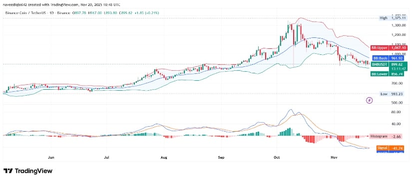 Die Zahlen zeigen, dass die BNB bei 899 US-Dollar unter Druck steht, da die Marktstimmung defensiv wird