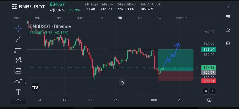 Der Markt hat auch eine Reihe höherer Tiefststände gebildet, ein frühes Anzeichen dafür, dass die Käufer an Stärke gewinnen. Diese Entwicklung findet statt, wenn Binance über dem mittleren Niveau um 822 bleibt, einem Bereich, der bei vergangenen Korrekturen wiederholt als Stabilisierungspunkt gedient hat. Die Beibehaltung dieses Bereichs ermöglicht es dem Diagramm, eine konstruktive Struktur beizubehalten und gleichzeitig das Risiko einer Rückkehr zu tieferen Unterstützungszonen zu verringern. 🦸♂️💫