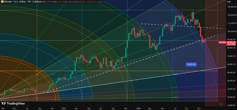 Der quantitative HĂ€ndler @KillaXBT, bekannt fĂŒr die Veröffentlichung von Modellen und Diagrammen, die selbst den erfahrensten Analysten ins Schwitzen bringen, hat eine mögliche mittelfristige Korrektur prognostiziert. Seine Diagramme – mit ihren komplizierten Überlagerungen der wilden Fahrt von Bitcoin im Jahr 2021 und seines schockierenden Absturzes um 75 % – deuten darauf hin, dass uns möglicherweise ein Ă€hnliches Schicksal bevorsteht. Aber er rĂ€t klugerweise: „Erschießen Sie nicht den Boten“, denn schließlich ist die Vorhersage der Zukunft von Bitcoin mit der Vorhersage des Wetters bei einem Tornado vergleichbar.