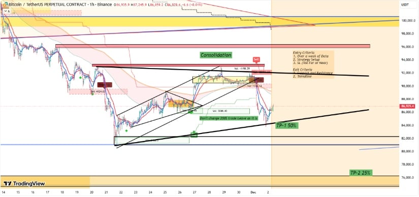 • Widerstandsniveaus: 86.500 $ (Ausbruchstest), 89.500–93.500 $ (Vorrat)