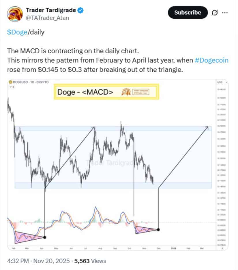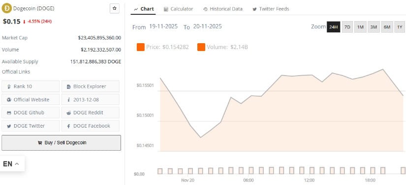 Am 20. November 2025 liegt der DOGE-Preis stabil bei 0,154 US-Dollar, obwohl er gegenüber seinen früheren Höchstständen von 0,160 US-Dollar einen leichten Rückgang erlitten hat. Auf dem Tages-Chart durchbricht es eine langfristige Trendlinie wie ein Bulle im Porzellanladen, wobei das Volumen schneller steigt als die Versprechen eines Politikers. Nun, Lautstärke ist eine gute Sache, aber kein goldenes Ticket nach Bullishville. 🚀📈