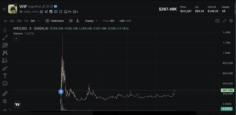 On-Chain-Daten, die zuverlässigsten Erzähler, zeigen, dass Großinvestoren in den Geschäften von Dogwifhat aktiver geworden sind, insbesondere nach seinem Debüt auf der Binance Smart Chain (BSC). Das WIF/USD-Paar hat laut GMGN.AI um 3,18 % zugelegt und schloss bei 0,000267 $. Liquidität und Transaktionszahlen, diese Barometer des Interesses, sind gestiegen, was darauf hindeutet, dass die Inhaber dieses Niveau als reife Akkumulationszone betrachten. 🕵️♂️📊