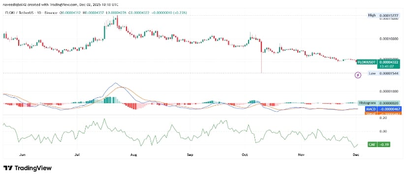 Kapitalströme? Schwächer als ein entkoffeinierter Espresso. Der Chaikin Money Flow (CMF) liegt bei -0,19, was Nettoabflüsse und nachhaltige Verteilung bestätigt. Lautstärkespitzen? Während der Abschlusswoche gedämpft wie eine Bibliothek. Damit FLOKI die Wende schafft, muss es 0,000048 bis 0,000050 US-Dollar zurückerobern, gepaart mit einem CMF über Null und einem MACD-Crossover. Wenn nicht? Es handelt sich um eine Seitwärts-Abwärtsbewegung mit 0,0000400 $ als nächster Unterstützungszone. Mein Rat? Schnappen Sie sich Popcorn und genießen Sie die Fahrt! 🍿🎢