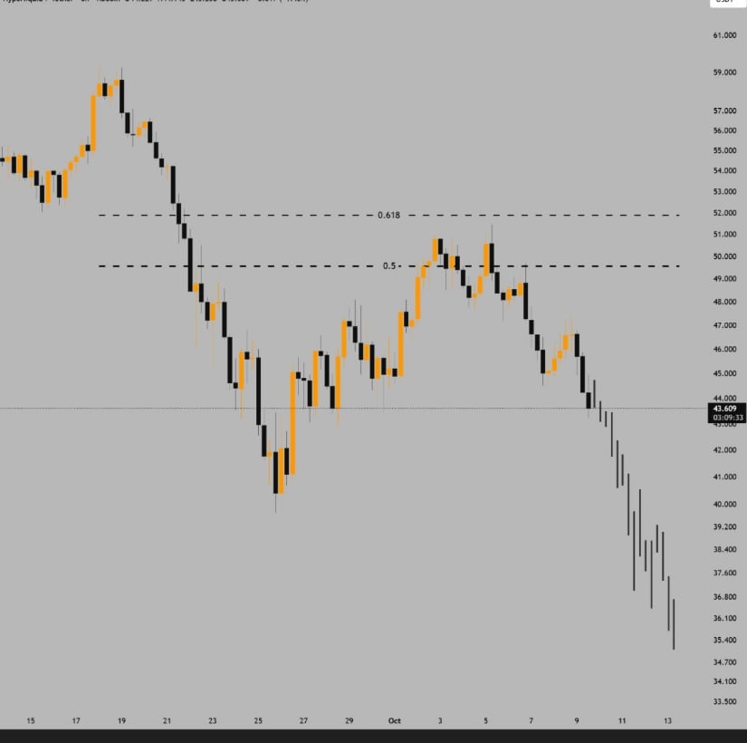 Im großen Theater der Märkte steht Hyperliquid am Abgrund, sein Preis schwankt wie ein Seiltänzer über dem Abgrund von 40 US-Dollar. Dies, lieber Leser, ist keine bloße Zahl – es ist der Rubikon, die Linie, die die Hoffnungsträger von den Hoffnungslosen, die Bullen von den Bären trennt. 🦬🐻