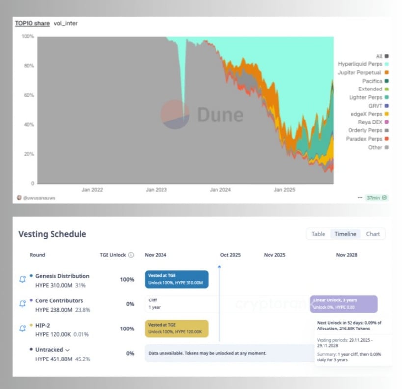 Leider ist die Erzählung nicht ohne Tücken. Die Dominanz von Hyperliquid schwindet, da Neueinsteiger um das Rampenlicht wetteifern, und eine bevorstehende Token-Freischaltung im November droht eine Angebotsflut auszulösen. Die kurzfristige Stimmung zittert wie ein Blatt im Wind. 🍃