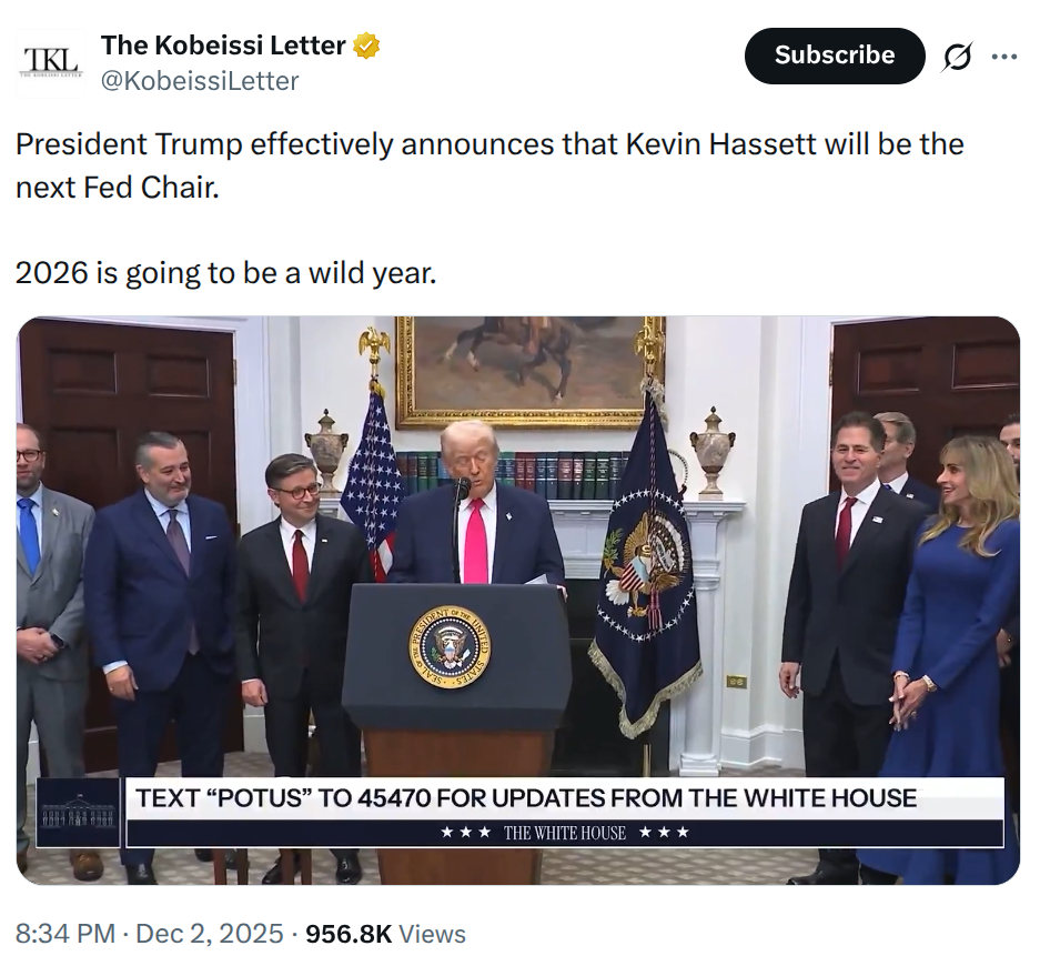 Spekulationen, dass Kevin Hassett die Fed mit einer gemäßigteren, risikofreudigeren Haltung übernehmen könnte, sind genau die Art von Makroverschiebung, die Krypto liebt. Trump nennt ihn namentlich, als wäre es ein Reality-TV-Casting. Wenn Hassett den Zuschlag erhält, müssen Sie sich auf einen Liquiditäts-Tsunami einstellen. Oder ein Müllcontainerbrand. So oder so, Krypto ist auf einer Achterbahnfahrt. 🎢