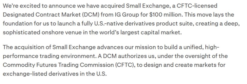 Der Kauf von Small Exchange setzt die aggressive Wachstumsstrategie von Kraken fort. Anfang des Jahres kaufte das Unternehmen NinjaTrader für 1,5 Milliarden US-Dollar und gewann damit 2 Millionen Kunden und Zugang zu an der CME notierten Terminkontrakten. Im September war Kraken durch die Übernahme von Breakout die erste große Krypto-Börse, die in den Eigenhandel einstieg. 🧙♂️📈