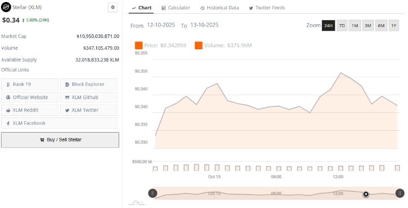 Laut den weisen Daten von BraveNewCoin schwimmt Stellar derzeit bei 0,34 US-Dollar, getragen von einem Anstieg von 5,80 % in den letzten 24 Stunden. Eine Kleinigkeit, könnte man sagen, bei einer Marktkapitalisierung von satten 10,95 Milliarden US-Dollar! Diese Erholung folgt auf eine chaotische Angelegenheit Anfang Oktober, bei der unsere arme Münze den Stich der Schwerkraft spürte und kurzzeitig unter die heiligen Unterstützungsniveaus fiel, bevor sie sich triumphierend erholte. Die Kakophonie des Handelsvolumens – über 347 Millionen US-Dollar – deutet auf die Rückkehr jener mutigen Seelen hin, die nach Tagen des Aufruhrs entschlossen wieder in den Kampf eingestiegen sind.