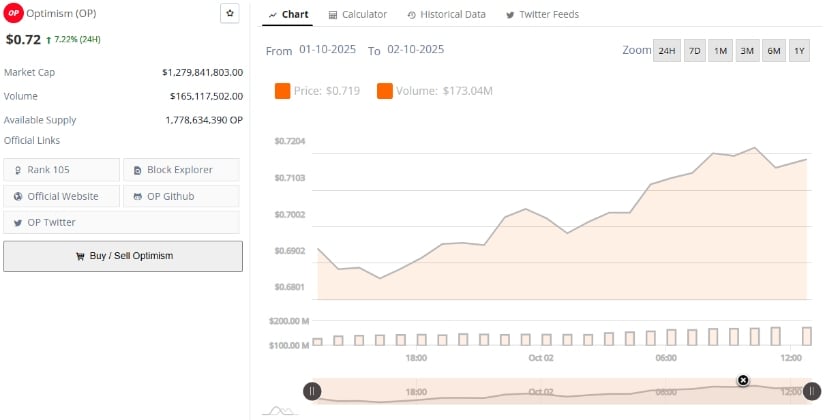 Optimismus, der Token des Augenblicks, handelt jetzt bei 0,72 USD, einem bescheidenen Anstieg von 7,22% in den letzten 24 Stunden. Sicher eine solide Leistung, aber es ist immer noch weit entfernt von den glorreichen Tagen seiner 2025 Höhen. Es hat eine Marktkapitalisierung von 1,28 Milliarden US -Dollar, wobei das tägliche Handelsvolumen über 165 Millionen US -Dollar übernimmt. Einzelhandel und institutionelle Händler sind also zurück oder zumindest für die Partei auftauchen. Das ist etwas, oder?