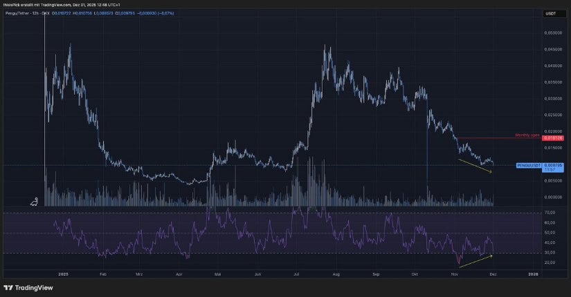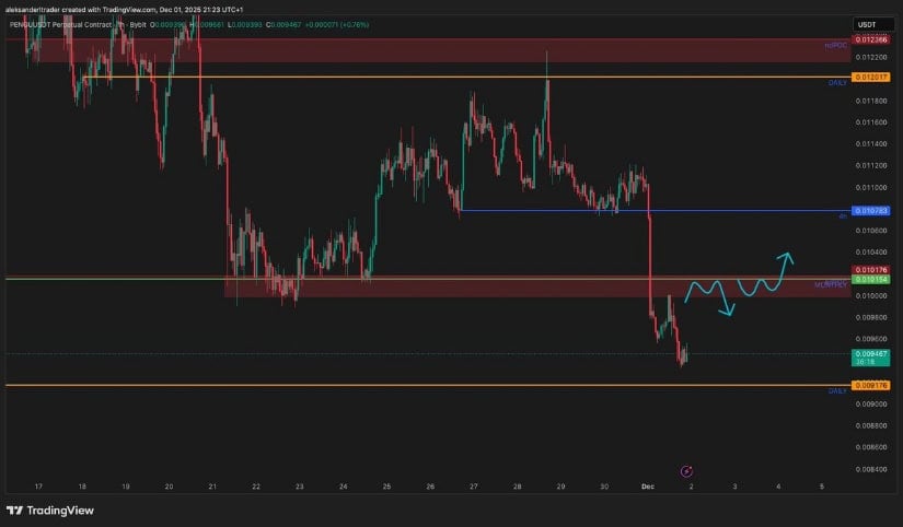 Am 2. Dezember 2025 wird PENGU bei nicht ganz so glamourösen 0,00976 $ gehandelt, 9 % weniger als in den letzten 24 Stunden. Die Marktkapitalisierung? Satte 613 Millionen US-Dollar, aber seien wir ehrlich, nach diesem Absturz geht es dem Unternehmen wahrscheinlich etwas schwer auf den Beinen. Aber zählen Sie dieses pummelige Tier noch nicht aus – Analysten gehen davon aus, dass es zu einer kurzfristigen Rallye kommen könnte, wenn sich die Käufer wie Pinguine in einem Schneesturm zusammenschließen und diese kritische Unterstützung festhalten können. Mal sehen, ob das passiert.
