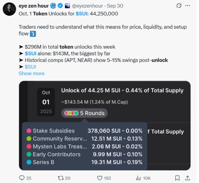 Leider verfolgt ein Gespenst Sui-A-Token-Freischaltung biblischer Proportionen! Vom 29. September bis 6. Oktober werden 44 Millionen Token im Wert von 143,9 Mio. USD den Markt überfluten. Eine Sintflut, ein Tsunami, eine wahre Apokalypse der Versorgung! 🌊💀 Und das, meine Freunde, ist nur ein Tropfen im Ozean, denn das Krypto -Reich steht im selben verfluchten Fenster einer Welle von 773 Millionen US -Dollar gegenüber.