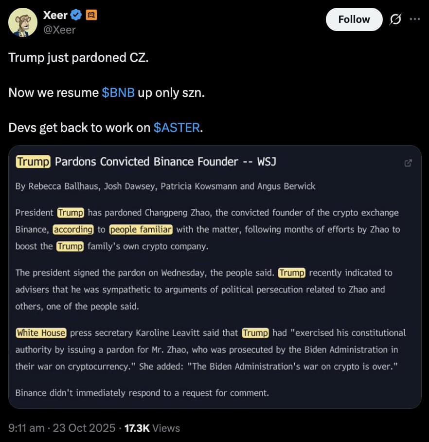 Nicht lange nach Bekanntwerden der Begnadigungsnachricht verbreiteten Händler in den sozialen Medien eine Flut optimistischer Kommentare zu $BNB und seinem ständig wachsenden Ökosystem. Es war fast so, als hätten sie auf einen Grund zum Jubeln gewartet.