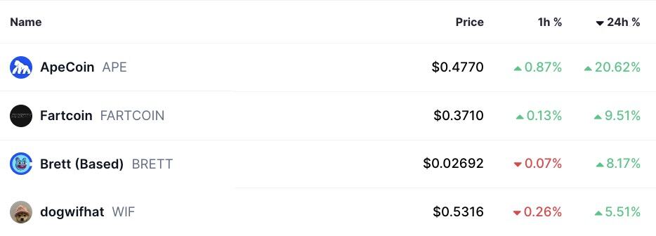ApeCoin ($APE) stieg um 20 % auf 0,4769 $ und gewann damit die zuvor verlorene Liquidität zurück. $Fartcoin ($FARTCOIN) und $Wif ($WIF) stiegen um 9 % bzw. 5–6 %.