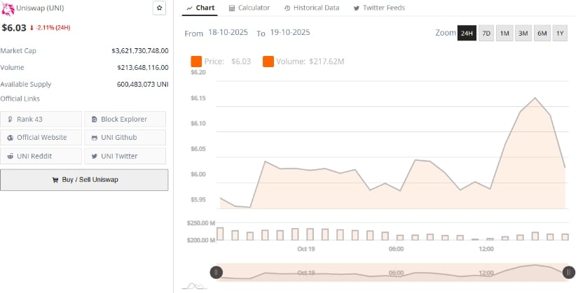 Laut BraveNewCoin wird Uniswap bei 6,03 US-Dollar gehandelt, was einem Rückgang von 2,11 % im Tagesverlauf entspricht, mit einer Marktkapitalisierung von 3,62 Milliarden US-Dollar und einem 24-Stunden-Handelsvolumen von 213,6 Millionen US-Dollar. Zirkulationsangebot? 600,48 Millionen Token und liegt damit weltweit auf Platz 43. Nicht allzu schäbig, aber auch nicht gerade eine Siegesrunde. 🏆→🤷♀️