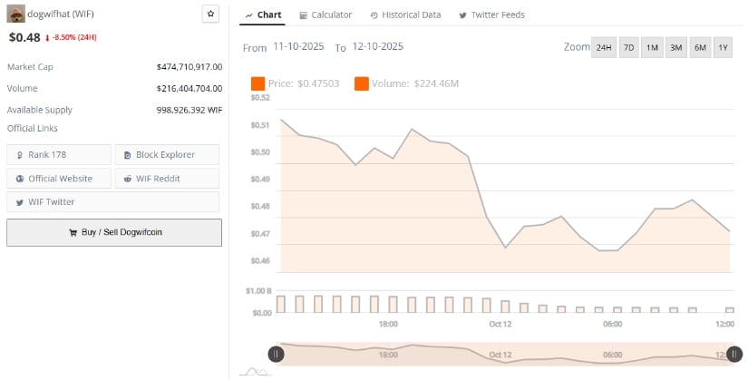 Und wissen Sie nicht, dass die Daten von BraveNewCoin zeigen, dass Dogwifhat bei 0,48 $ notiert, was einem Rückgang von satten 8,5 % am letzten Tag entspricht – autsch! – mit einer Marktkapitalisierung von 474,7 Millionen US-Dollar, während das 24-Stunden-Handelsvolumen bei 216 Millionen US-Dollar liegt. Reine Spekulation, Leute, trotz dieser schlimmen Einbrüche, als würde die Münze eine nie endende Party auf der Solana-Blockchain veranstalten. 🎉