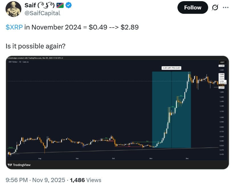Schauen Sie, das Gerede auf der Twittersphere ist lebhaft – X-Nutzer sorgen für Aufregung und erinnern sich an die Achterbahnfahrt von XRP von winzigen 0,49 $ auf robuste 2,89 $ im November 2024. Könnte der Blitz dreimal zuschlagen? Nun, die Optimisten wagen es zu träumen.