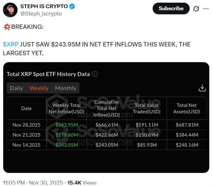 Halten Sie Ihren Applaus – der institutionelle Fanclub von XRP ist zurück. Laut @Steph_iscrypto flossen letzte Woche rekordverdächtige 243,95 Millionen US-Dollar in XRP-Spot-ETFs. Das ist eine Menge institutionelles Geld, selbst in einem Markt, der wie ein verkochtes Steak zusammenbricht. Dieser Anstieg kommt trotz schwankender XRP-Preise und zeigt, dass die Großen immer noch daran interessiert sind, mitzuspielen. Vielleicht wissen sie etwas, was wir nicht wissen? 🤔