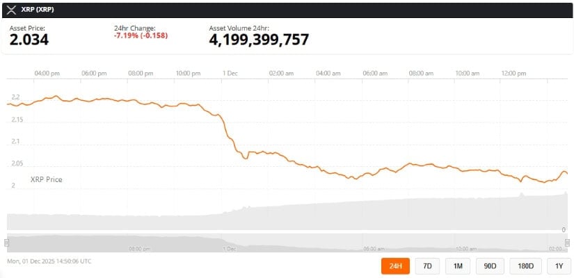 Also, was ist los? Der Preis von XRP ist auf nur noch 2,03 US-Dollar gesunken, was einem Rückgang von 7,19 % entspricht. Ein tragischer Rückgang von seinem früheren Höchststand von 3 US-Dollar, ja, aber er hält sich trotzdem am Leben. Dieser Rückgang folgt auf wochenlangen Verkaufsdruck – denn wer freut sich nicht über eine kleine Abwärtsspirale in der volatilen Welt der Kryptowährungen? Dennoch bleibt die Liquidität erschreckend hoch. Was für eine Erleichterung. Zumindest ist jemand auf diesem Markt glücklich. 🤷♂️